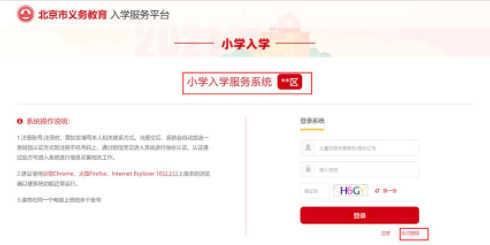 1. 忘记“小学入学服务平台”登录密码的用户可以通过“忘记密码”功能,在通过信息验证后重新设置密码。进入小学入学服务系统登陆页面,点击“忘记密码”。