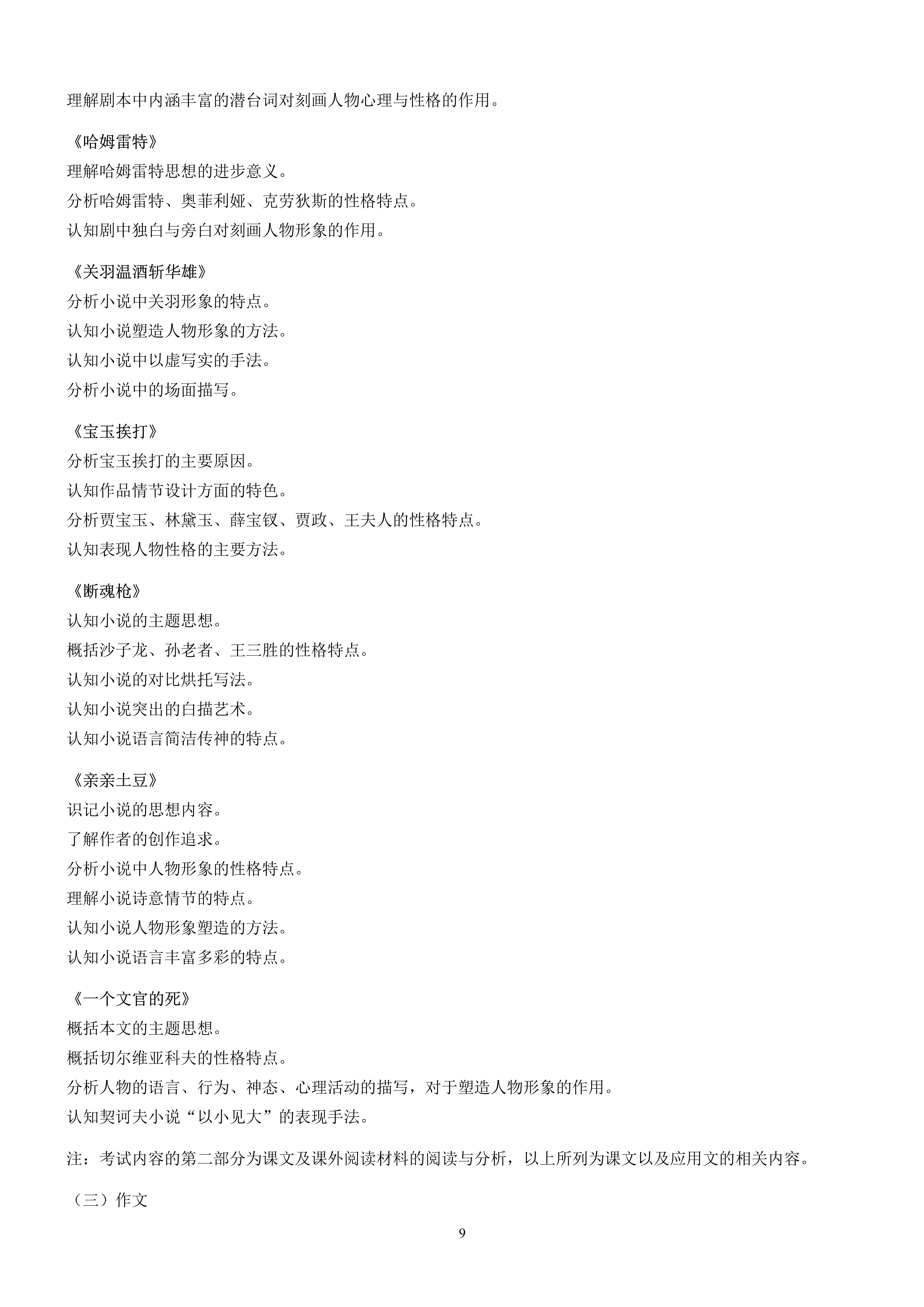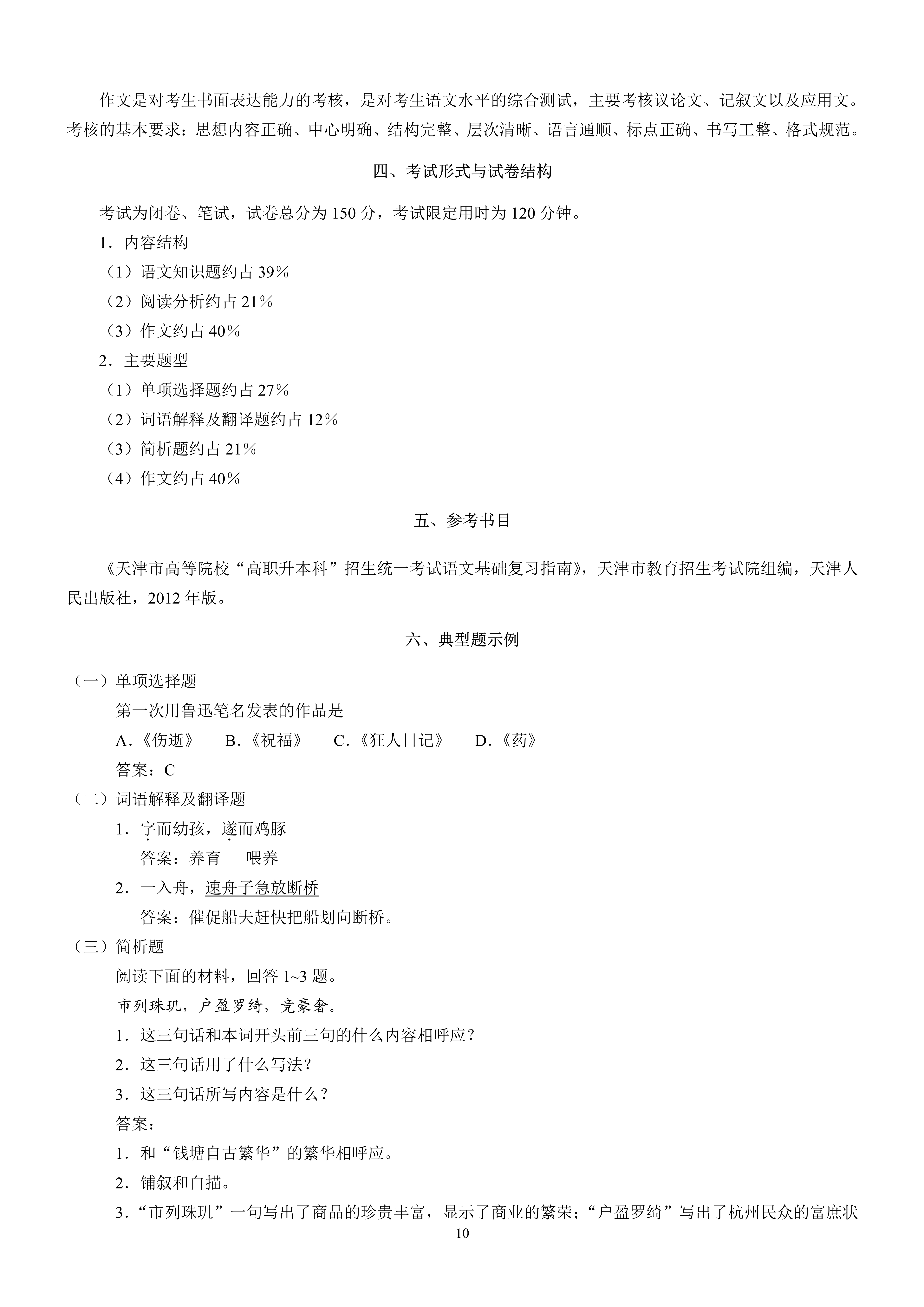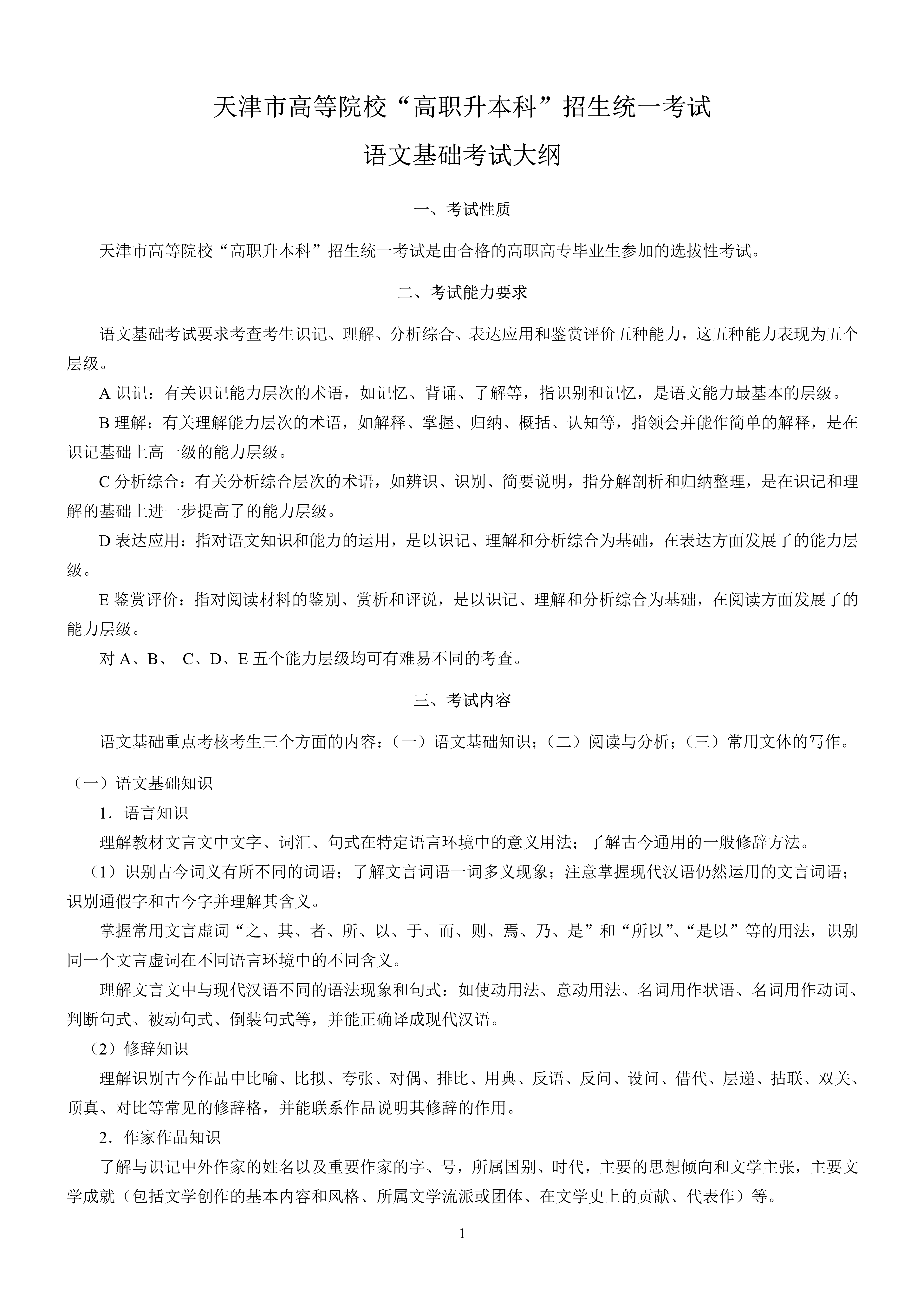 天津市高职升本科考试语文基础考试大纲