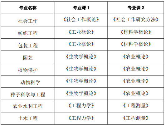 专业课考试大纲、专业课参考书目具体请查询安徽农业大学本科招生信息网通知http://zsb.ahau.edu.cn/info/1009/2141.htm。免试退役士兵面试申请:在安徽省应征入伍的具有普通高职(专科)学历的退役士兵中,高职(专科)毕业生及在校生(含高校新生)应征入伍,退役后完成高职(专科)学业,专科阶段专业符合我校免试退役士兵专业要求范围的,可报考我校免试退役士兵计划申请参加面试考核(职业适应性及职业技能综合考查),经资格审核通过,完成报名程序后,学校将组织开展面试考核。各免试退役士兵专业范围要求如下:社会工作:财经商贸大类、公共管理与服务大类、公安与司法大类、文化艺术大类农业水利工程:水利大类、土木建筑大类、交通运输大类、能源动力与材料大类土木工程:水利大类、土木建筑大类、交通运输大类、能源动力与材料大类。
