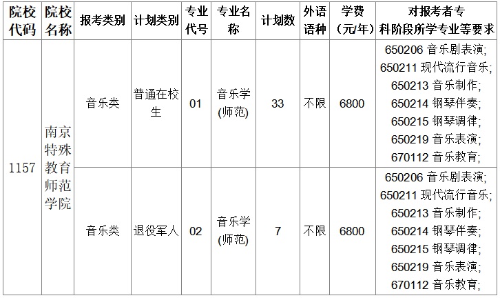 经江苏省教育厅批准,南京特殊教育师范学院(招生代码1157)2022年面向全省招收“专转本”学生,招生专业、计划及报考要求具体如下: