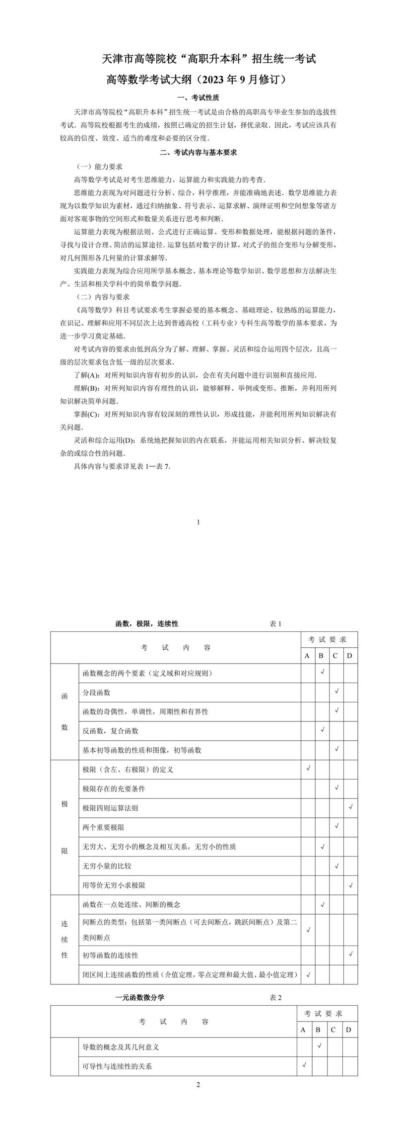 2024年天津专升本考试大纲已经公布,参加2024年天津专升本考试的同学,需要参加院校的专业考试和市招生办的文化统考,其中,文化考试科目分文理科,文科考试科目:语文基础,大学英语,计算机应用基础;理科:高等数学,大学英语,计算机应用基础,各科目分值为150分,总分是450分,下面是和大家分享的高等数学科目的专升本考试大纲,参加天津专升本的同学可以参考一下哦。