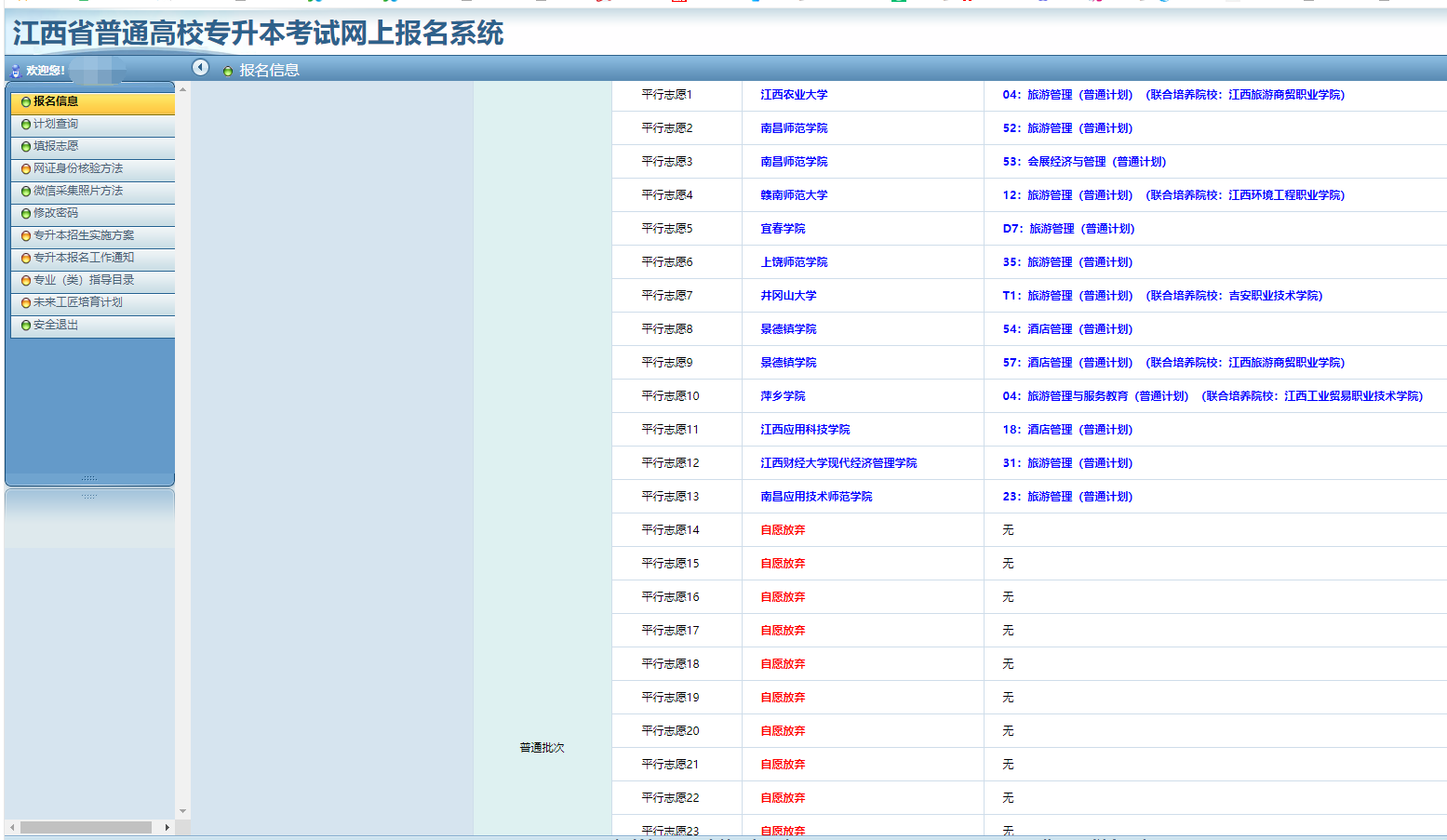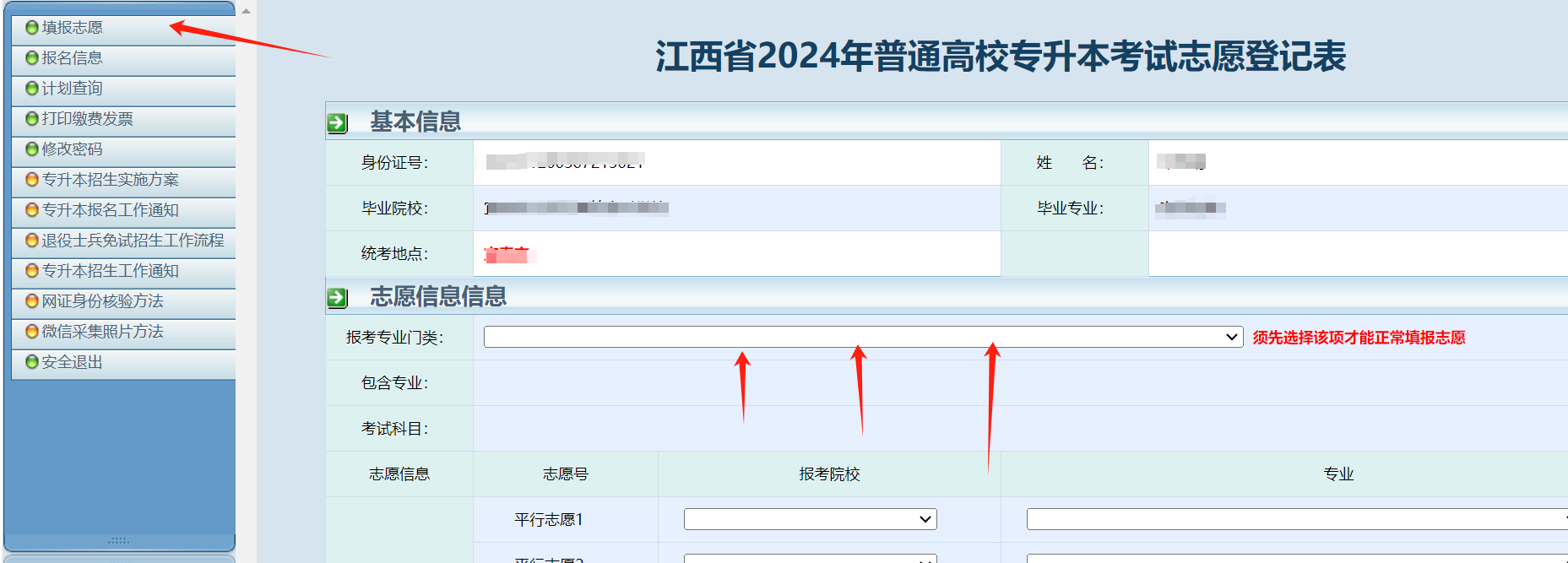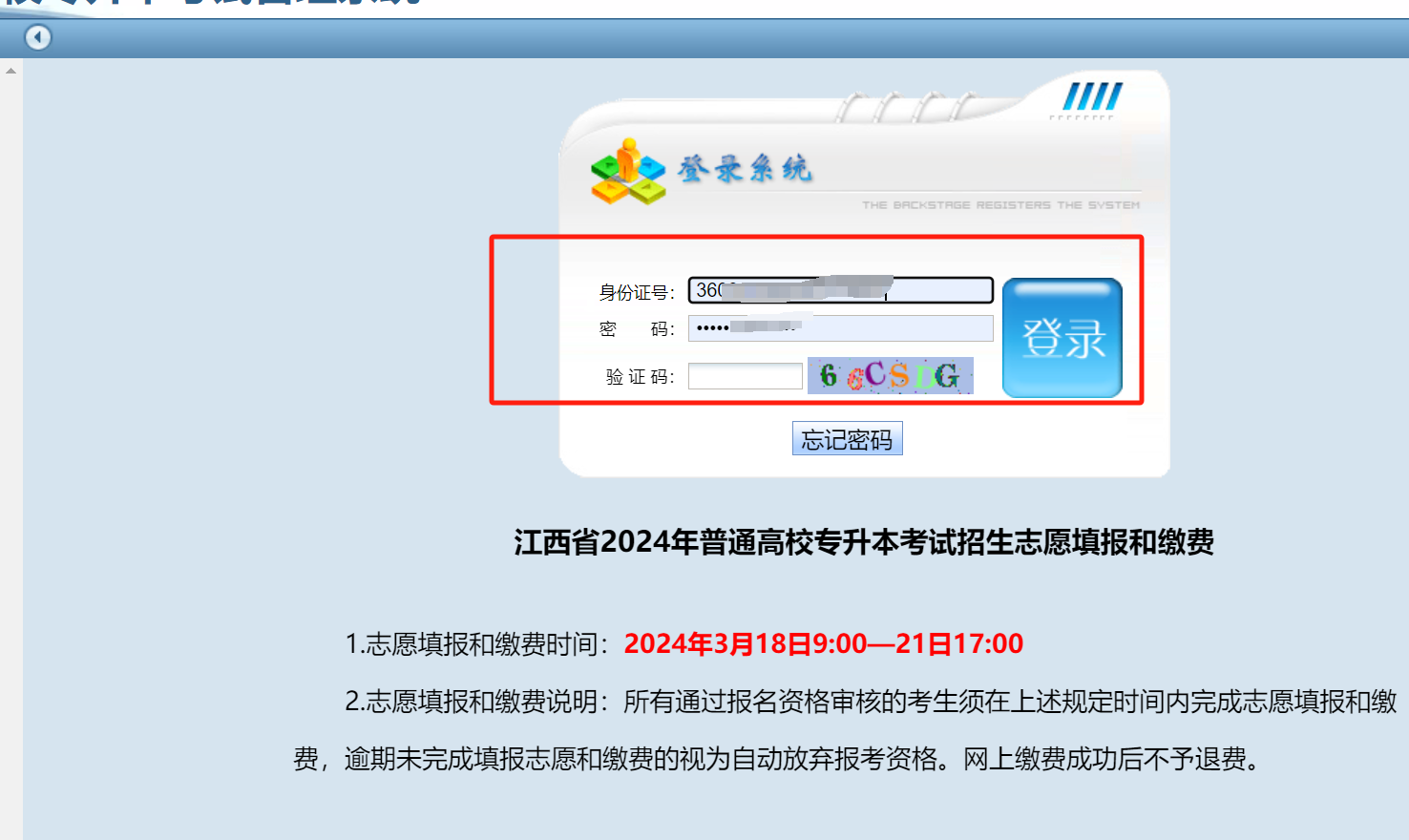 所有通过报名资格审核的考生须在2024年3月18日9:00-21日17:00期间,登录江西省教育考试院网(网址:www.jxeea.cn,下同)“专升本管理系统”,在9个招考类别中选报其中1个大类参加该大类专业基础及技能知识课考试,并完成志愿填报和缴费(130元/人),逾期未完成填报志愿和缴费的视为自动放弃报考资格。网上缴费成功后不予退费。