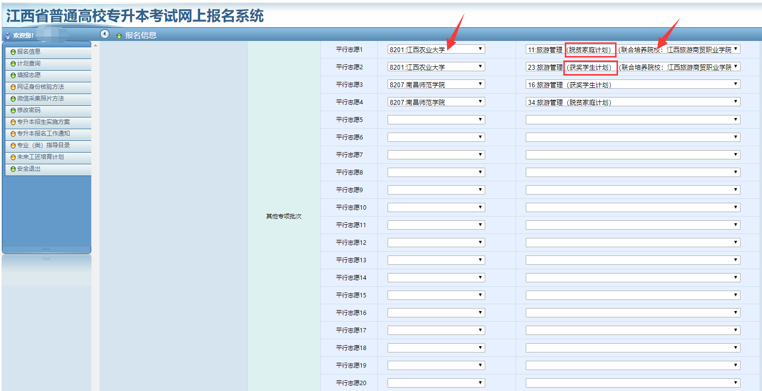 “其它专项计划”批次志愿填报。限具有脱贫家庭(原建档立卡贫困家庭)学生或获奖学生(含高水平运动员)资格且已通过资格审核的考生填报。根据各校招生专业情况,最多可填报20个平行志愿。平行志愿均采用“院校+专业”模式,即1个院校的1个专业为1个志愿。(如下图)