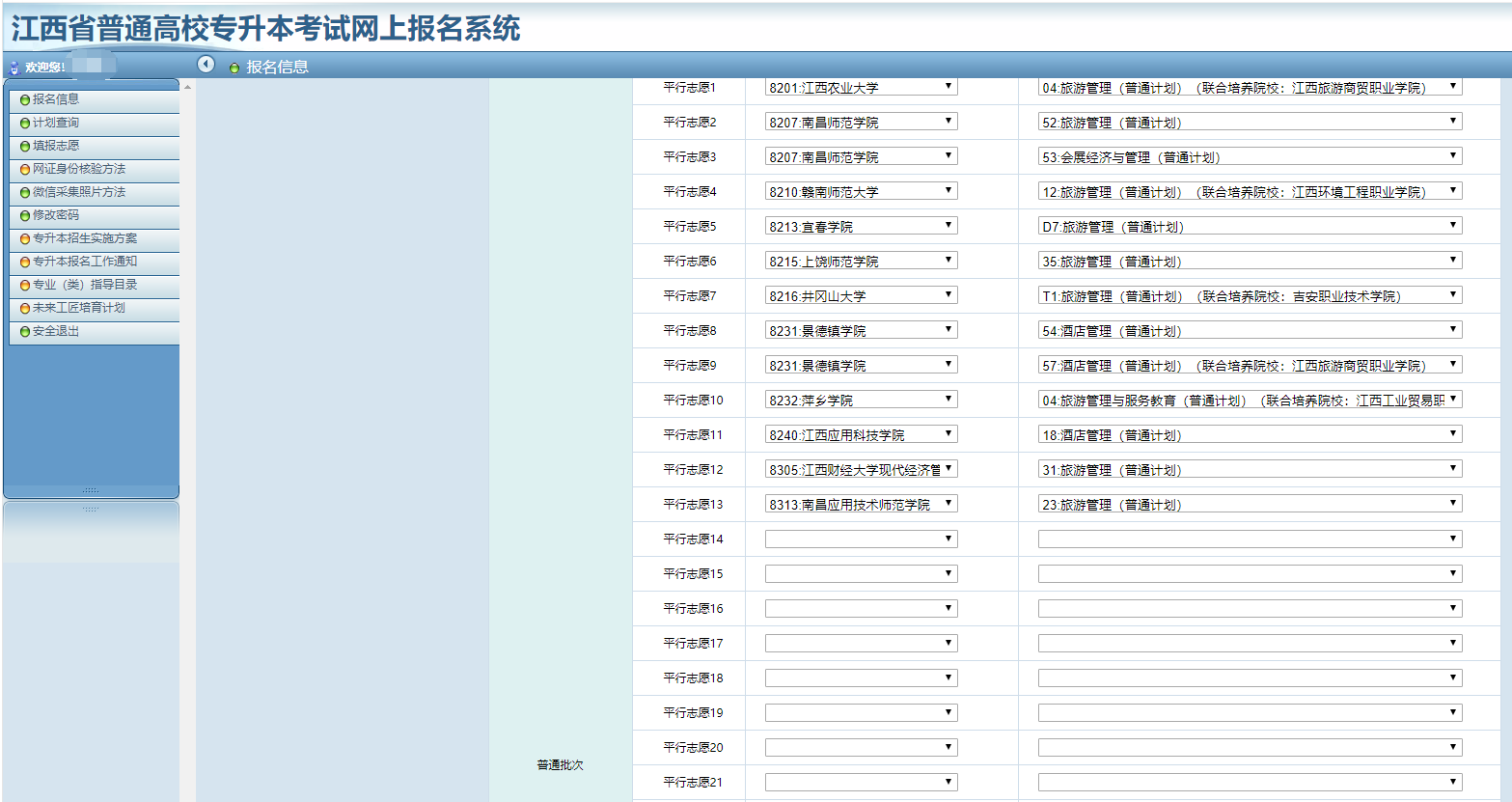 “普通计划”批次志愿填报。所有通过资格审核的考生均可以填报此批次志愿。根据各校招生专业情况,最多可填报40个平行志愿。平行志愿均采用“院校+专业”模式,即1个院校的1个专业为1个志愿。(如下图)