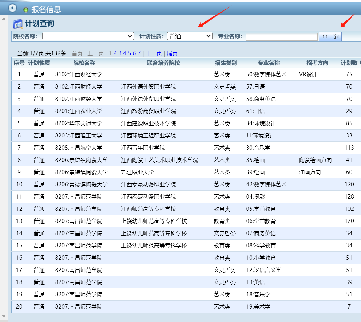 6.页面显示考生能报考的普通计划的院校名称、联合培养院校、专业名称、计划数、收费标准等信息。(如下图)