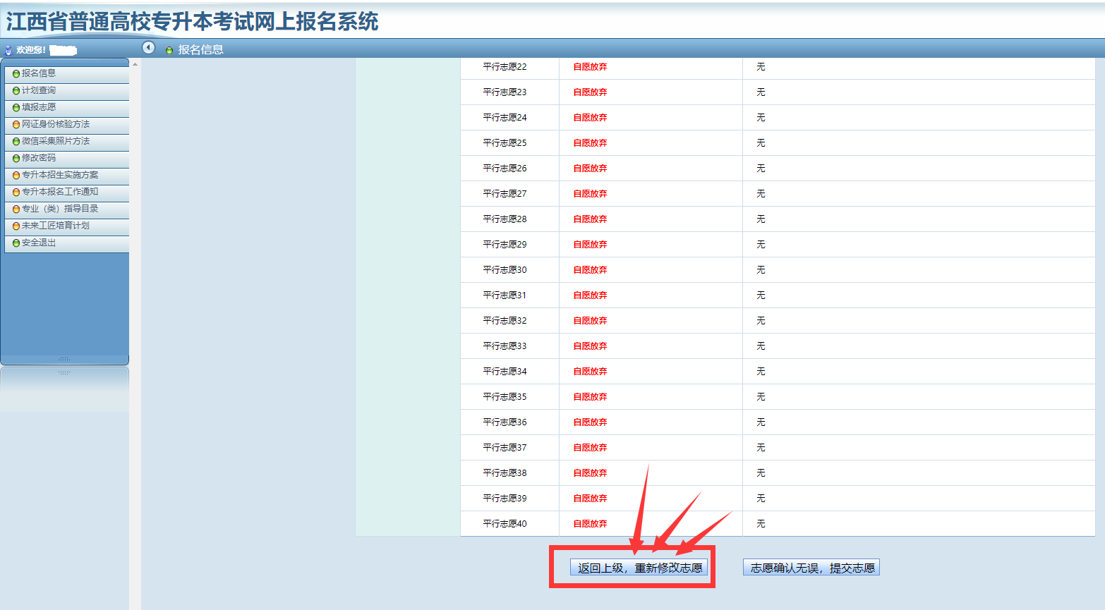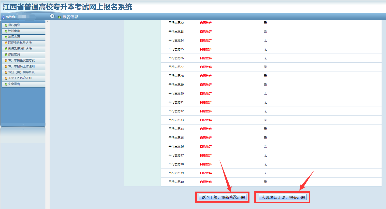 11.若志愿需要修改,可点击“返回上一级,重新修改志愿”。若确认志愿填报无误,则点击“志愿确认无误,提交志愿”。(如下图)