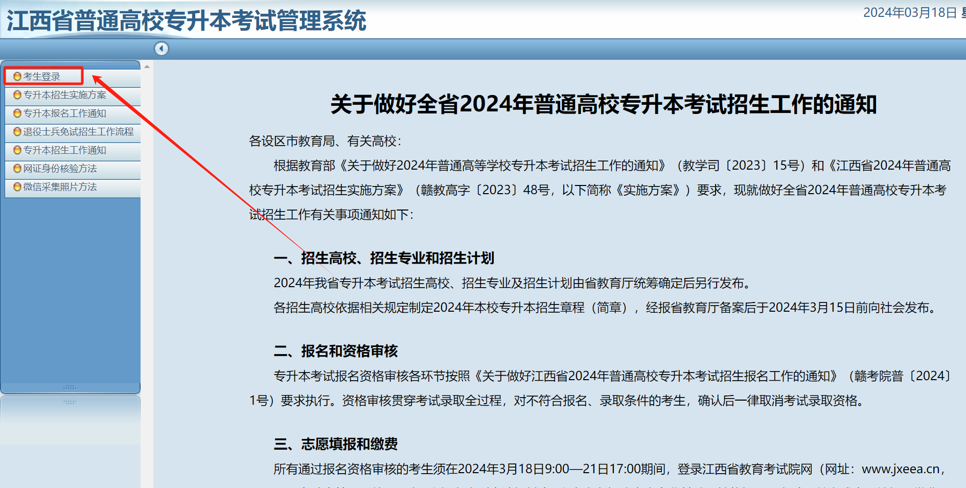 2.在“江西省普通高校专升本考试网上报名系统”左侧任务栏点击“考生登录”,进入登录页面。(如下图)