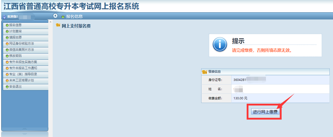 13.志愿提交成功,进入网上缴费环节。核对缴费信息无误后,点击“进行网上缴费”,系统弹框提示“是否确定进行网上缴费”,点击“确定”跳转至缴费页面。(如下图)