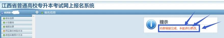 19.志愿修改完毕,页面提示“志愿填报完成,不能进行修改”。(如下图)
