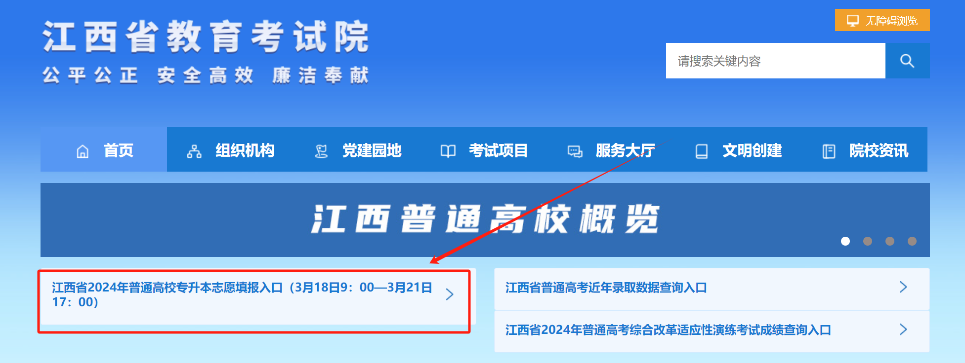 1.登录江西省教育考试院网站(www.jxeea.cn),进入“江西省普通高校专升本志愿填报入口”。(如下图)