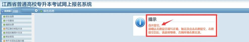 10.在查看志愿确认表页面,再次检查所填志愿是否全部填写到位,此次页面会提示是首次提交志愿。(如下图)