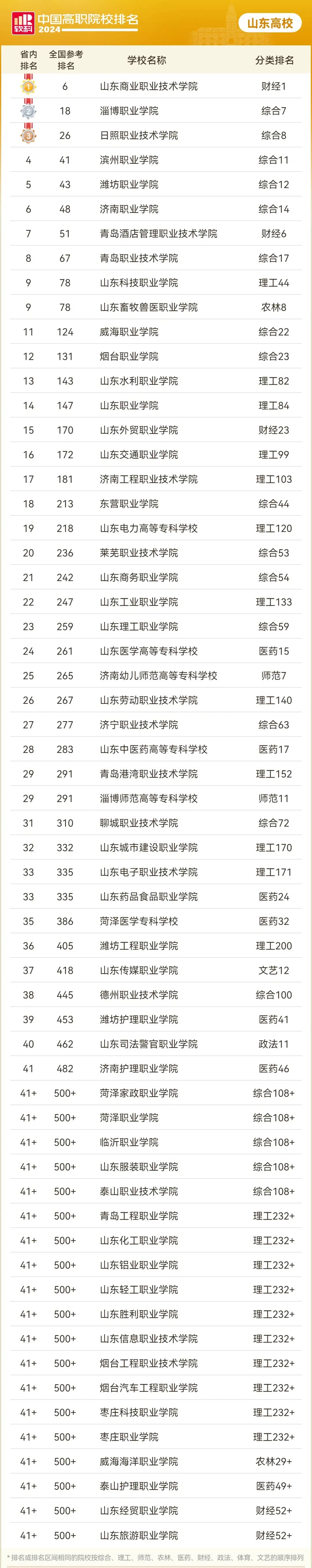 山东省共有60所公办高职院校上榜,在本省公办总榜中排名前三的依次是山东商业职业技术学院、淄博职业学院和日照职业技术学院,如下图所示: