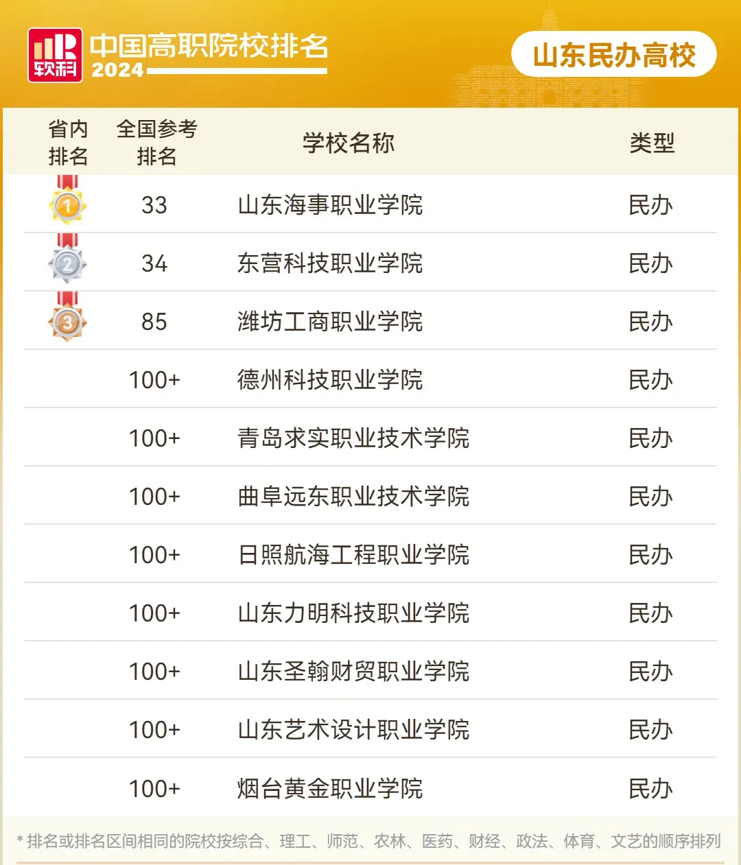 除开公办排名,民办也有排名。山东省共有11所民办高职院校上榜,在本省民办总榜中排名前三的依次是山东海事职业学院、东营科技职业学院和潍坊工商职业学院,如下图所示: