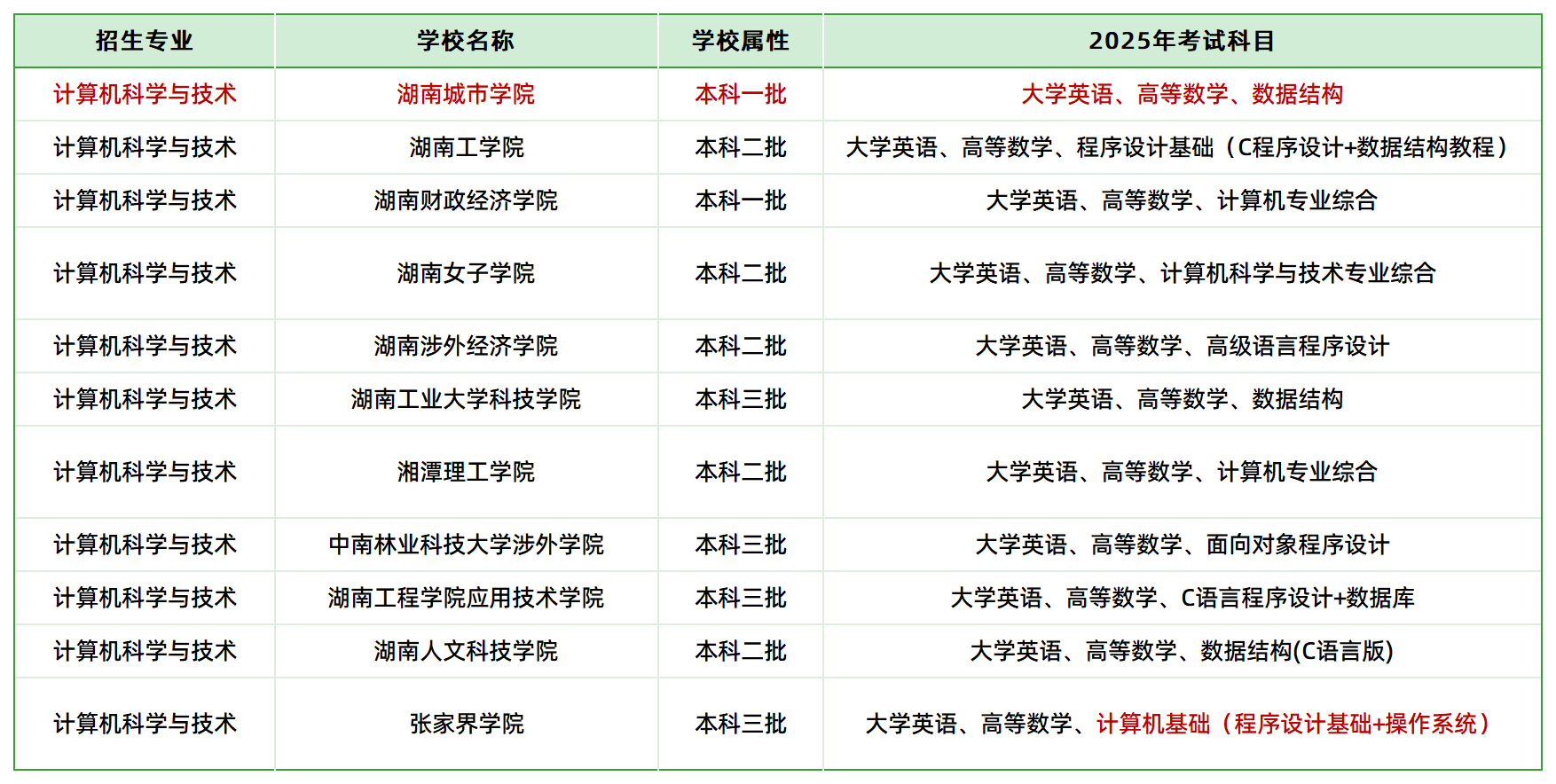 本文主要介绍2025年湖南统招专升本计算机科学与技术专业招生情况,该专业今年共11所院校招生,其中湖南城市学院新增该专业招生,其考试科目为数据结构,张家界学院考试科目为计算机基础。对该专业感兴趣的同学可以关注一下:
