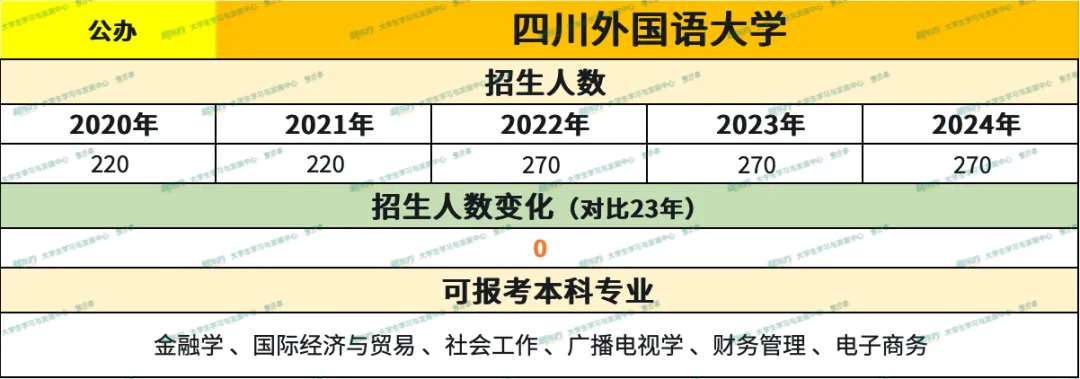 四川外国语大学2020年和2021年的招生人数均为220人,而从2022年开始,招生人数增加到了270人,并在2023年和2024年保持不变。与2023年相比,2024年的招生人数没有变化。可报考的本科专业包括金融学、国际经济与贸易、社会工作、广播电视学、财务管理和电子商务,这些专业为学生提供了多样化的学习选择和职业发展路径。