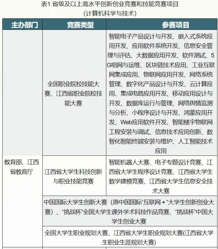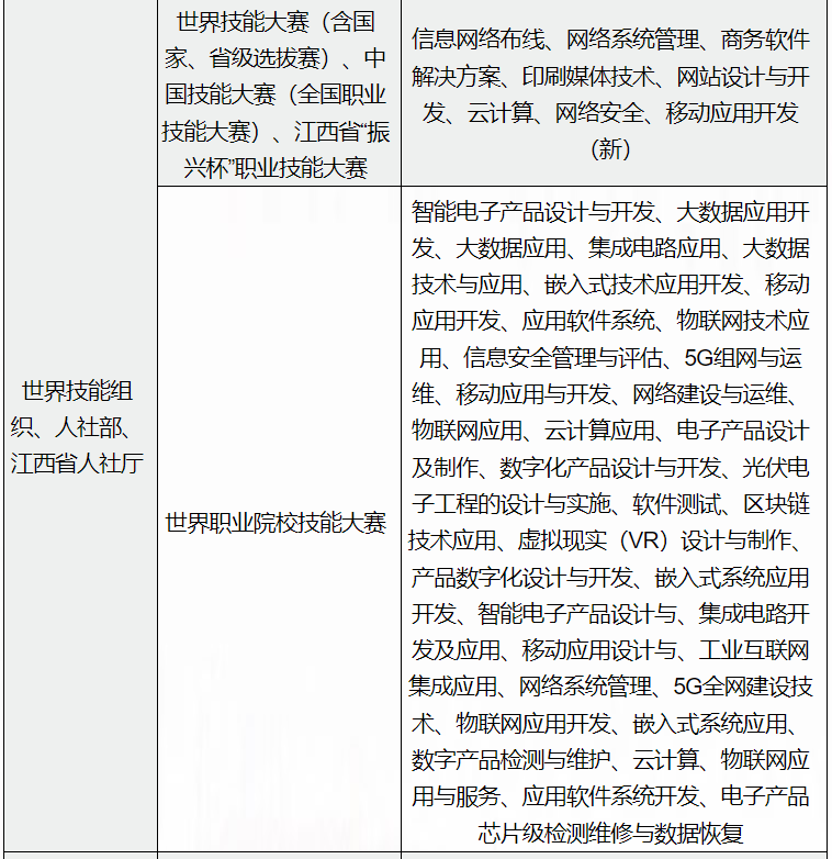 在高职(专科)就读期间,参加以下竞赛之一并获奖:世界技能大赛全国选拔赛资格、全国技能大赛一类赛、全国职业院校技能大赛或世界职业院校技能大赛总决赛、全省职业技能大赛、全省职业院校技能大赛;@中国国际“互联网+”大学生创新创业大赛(中国国际大学生创新大赛)、江西省大学生创新大赛;①全国大学生职业规划大赛、江西省大学生职业生涯规划大赛。