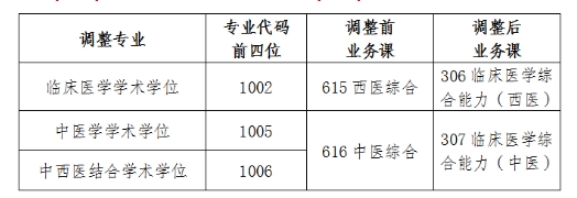二、中医学、中西医结合学术学位:专业代码前四位为“1005”和“1006”的专业初试科目业务课由自命题科目“616中医综合”调整为国家统考科目“307临床医学综合能力(中医)”。306临床医学综合能力(西医)、307临床医学综合能力(中医)考试大纲以教育部教育考试院统一公布为准。